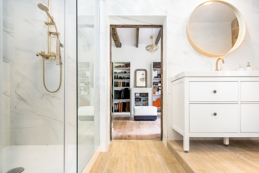 Au premier étage, un palier de ± 4 m² donne accès à deux chambres, une de ± 20 m² et la chambre principale de ± 28 m² avec un dressing de ± 18 m² et une salle de bain de ± 8 m². Un couloir de ± 14 m² mène à une mezzanine de ± 9 m² qui peut être utilisée comme bureau et une salle de douche complète cet étage.